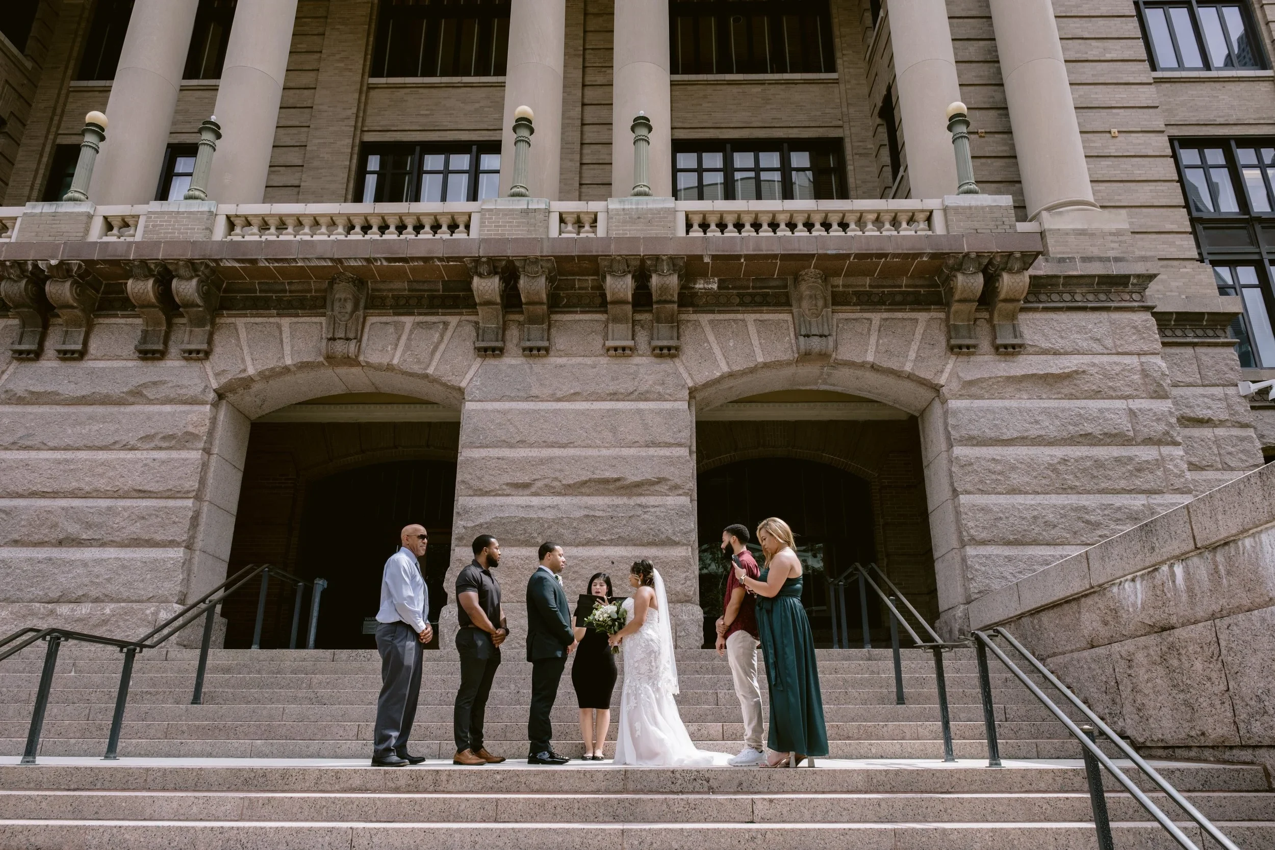 Your courthouse ceremony may be short and sweet, but the celebration doesn’t end there. Many couples explore downtown Houston for portraits, from the courthouse steps to chic city streets and nearby parks. Afterward, you can continue the celebration with a dinner at one of Houston’s amazing restaurants or a cozy gathering with your closest people.